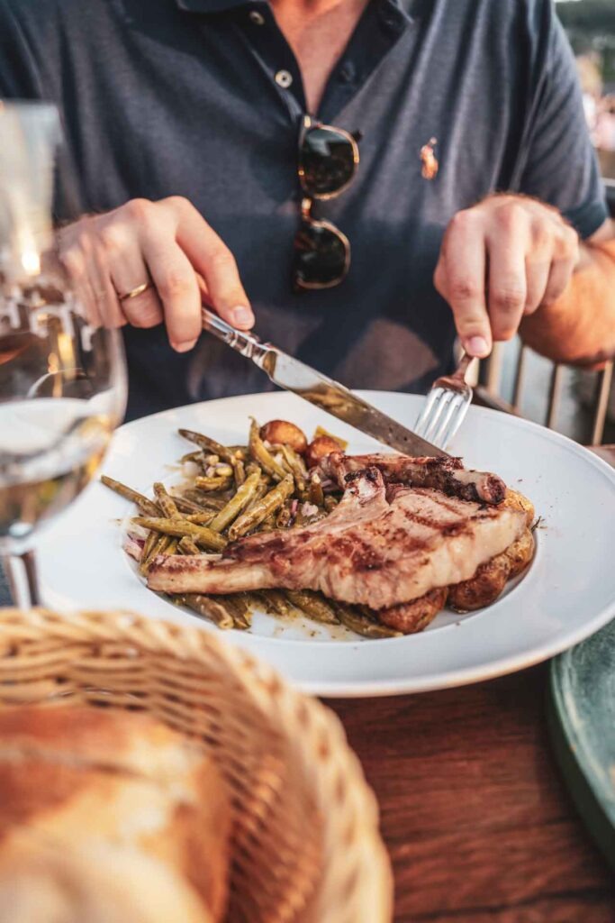 Wir entscheiden uns an diesem Abend für ein Steak vom Ibericoschwein mit Speckbohnen von der Tageskarte und im Silvanersud pochiertes Wallerfilet mit frischem Meerrettich und herrlich knusprigem Steinofenbaguette.