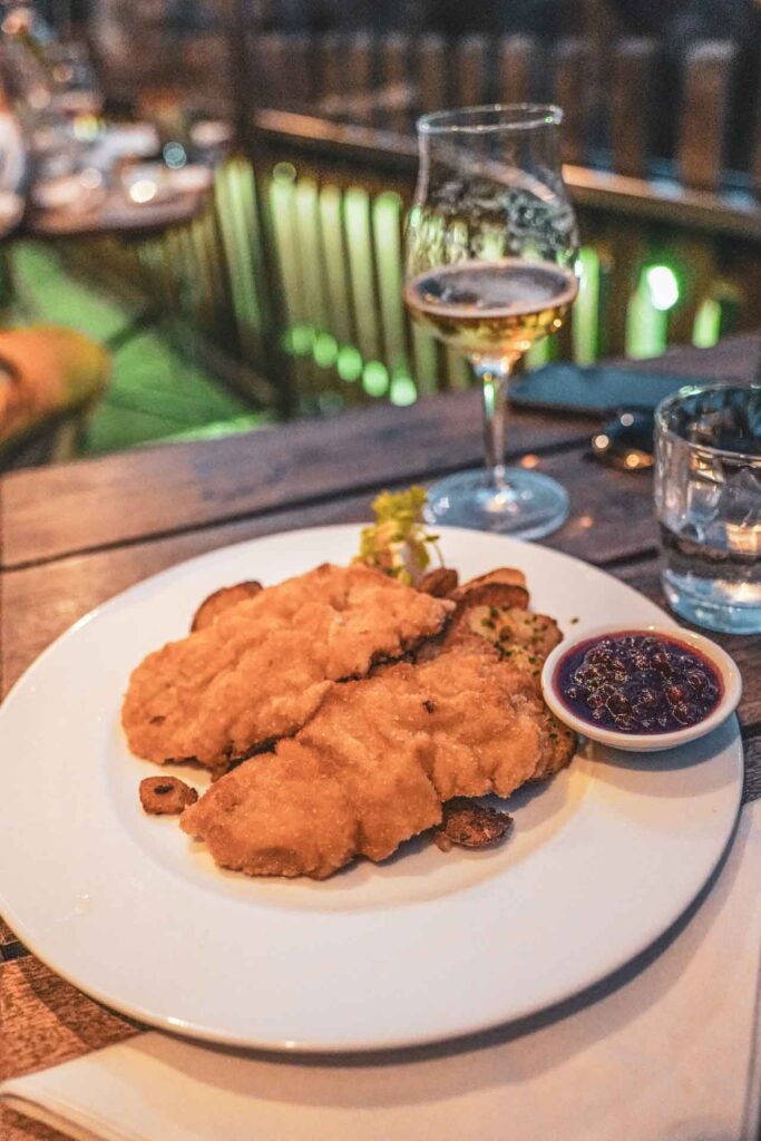 Auch der Hauptgang ließ keine Wünsche offen: Wir entschieden uns für ein perfekt gebackenes Wiener Schnitzel und das Nikolaushof Pfännchen, eine Zusammenstellung aus gebratenem Filet vom Landschwein in Waldpilzrahm mit sautierten Bohnen und gebräunten Spätzle, die hübsch in einer kleinen Servierpfanne angerichtet war.