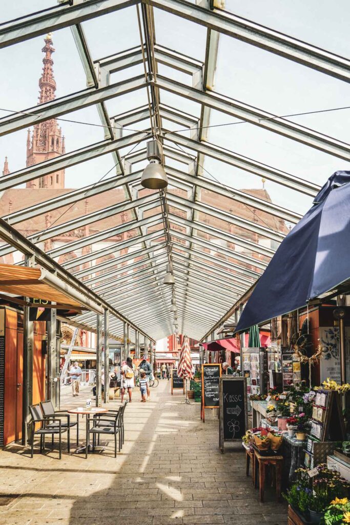 Hier gibt es von Obst und Gemüse über Feinkost sowie Metzger- und Backwaren alles, was einen Marktbesuch zu einem echten Foodie-Erlebnis macht. Auch findet ihr hier garantiert etwas Passendes für ein kleines Weinpicknick auf der Alten Mainbrücke, die ihr von hier aus in nur wenigen Gehminuten erreicht.