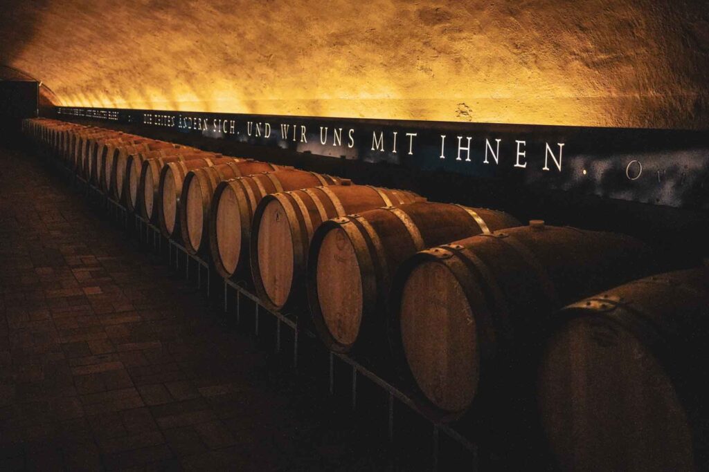 Nun geht es in die heiligen Hallen des Weinguts: Wir steigen hinab in den historischen Holzfasskeller, der unter dem riesigen Areal des Fürstenbaus liegt und sich auf insgesamt 250 Metern erstreckt. Allein dafür hat sich die Führung schon gelohnt, denn dieser Weinkeller ist einfach nur atemberaubend!